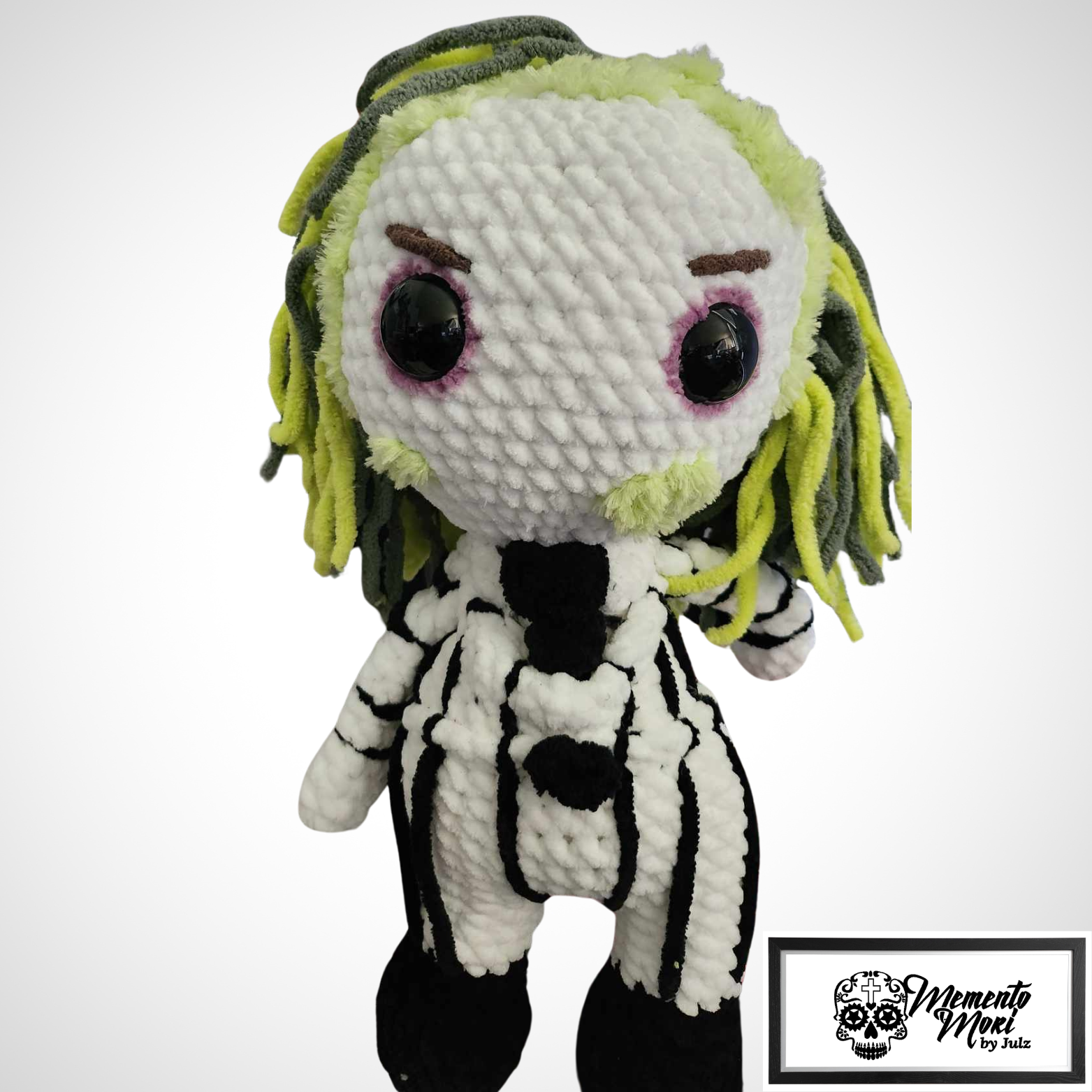 Bring home the bio-exorcist himself! This adorable yet spooky crochet Beetlejuice doll is handmade with soft, plush yarn. Standing ready for any haunting, this little mischief-maker features his iconic black and white striped suit, wild green and black hair, and expressive embroidered brows. A must-have collectible for any fan of the classic film.
